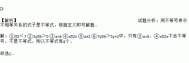 数学表达式:①-5<7;②3y-6>0;③a=6;④x-2x;⑤a≠2;⑥7y-6>5y+2中,是不等式的有( )