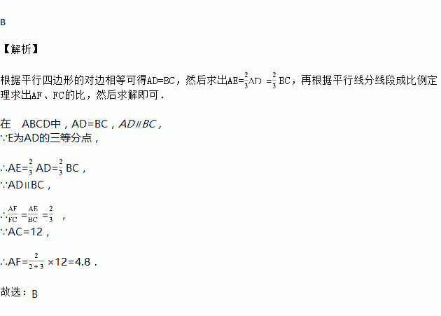 如图,在?ABCD中,E为AD的三等分点,AE=AD,连接BE交AC于点F,AC=12,则AF为( )