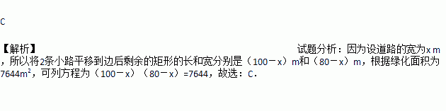 如图,在长为100 m,宽为80 m的矩形场地上修建两条宽度相等且互相垂直的道路,剩余部分进行绿化,要使绿化面积为7644m2,则道路的宽应为多少米?设道路的宽为x m,则可列方程为 ( )