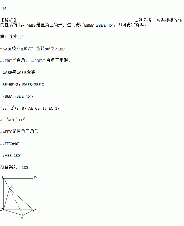 如图,点E是正方形ABCD内的一点,连接AE、BE、CE,将△ABE绕点B顺时针旋转90°到△CBE′的位置.若AE=1,BE=2,CE=3,则∠BE′C=__度.