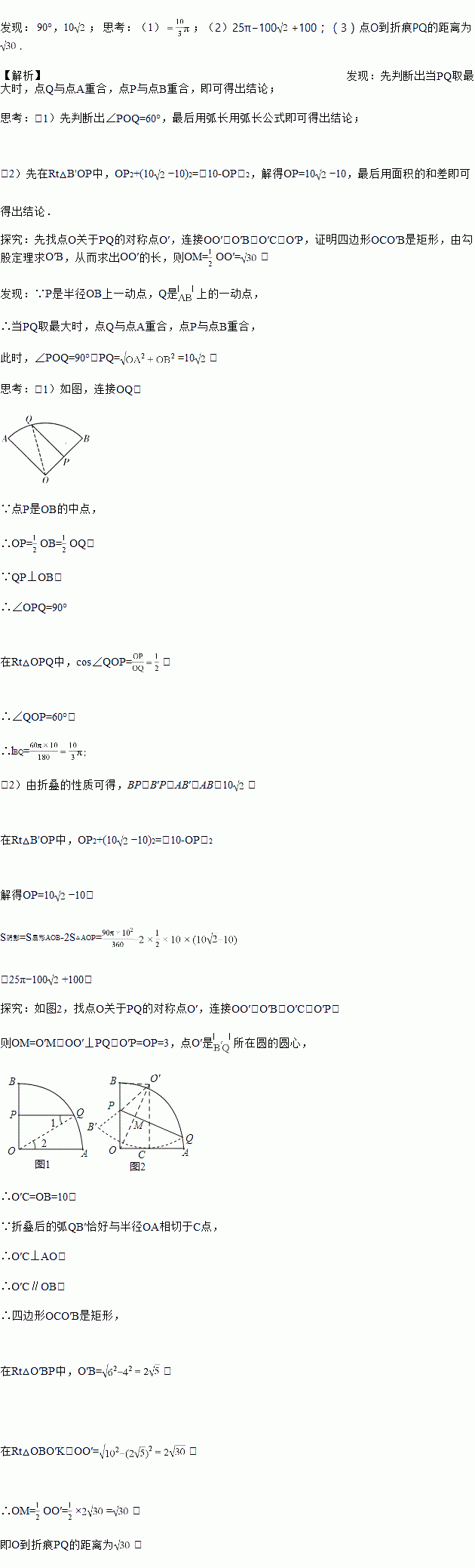 ̽¾¿£ºÈçͼ4£¬½«ÉÈÐÎOABÑØPQÕÛµþ£¬Ê¹ÕÛµþºóµÄ»¡QB¡äÇ¡ºÃÓë°ë¾¶OAÏàÇУ¬ÇеãΪC£¬ÈôOP£½6£¬ÇóµãOµ½ÕÛºÛPQµÄ¾àÀ룮