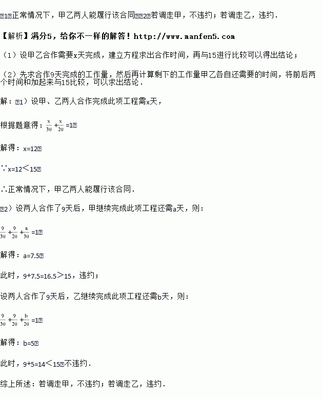 甲乙两人想共同承包一项工程,甲单独做30天完成,乙单独做20天完成,合同规定15天完成,若完不成视为违约,甲乙两人经过商量后签订了该合同.