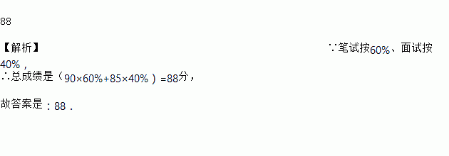 某招聘考试分笔试和面试两种.其中笔试按60%、面试按40%计算加权平均数作为总成绩.小明笔试成绩为90分.面试成绩为85分,那么小明的总成绩为_____分.