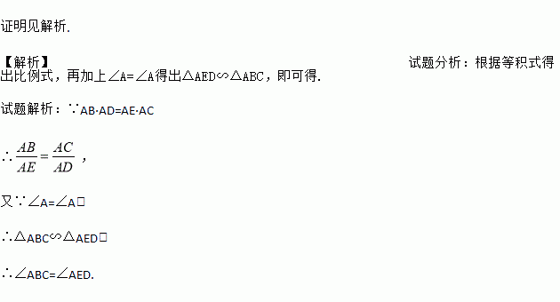 如图,△ABC中,D、E分别是AB、AC上的点,且满足AB·AD=AE·AC,连接DE. 求证:∠ABC=∠AED.