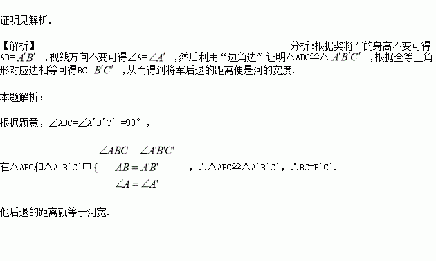 如图所示,传说在19世纪初,一位将军率领部队在一河边与敌军激战,为使炮弹准确地落在河对岸的敌军阵地,将军站在河这岸,将帽檐压低,使视线沿着帽檐恰好落在河对岸的边线上,然后他向后退(保证B′、B、C在一条直线上),一直退到视线落在河这岸的边线上为止,这时,他后退的距离就等于河宽,这是为什么?请给予证明.