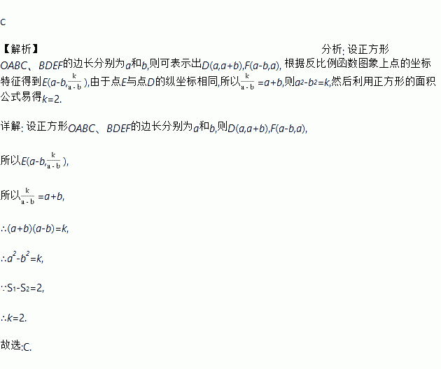 如图,四边形OABC、BDEF是面积分别为、的正方形,点A在x轴上,点F在BC上,点E在反比例函数(k>0)的图象上,若,则k值为( )
