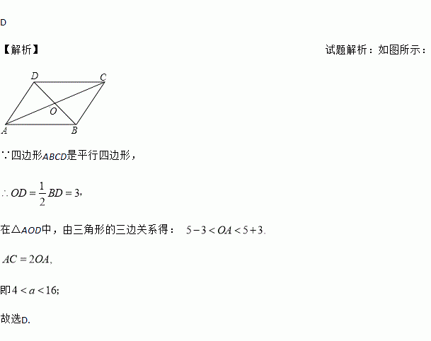 如图,□ABCD中,AD=5,BD=6,AC=a,则a的取值范围是( )