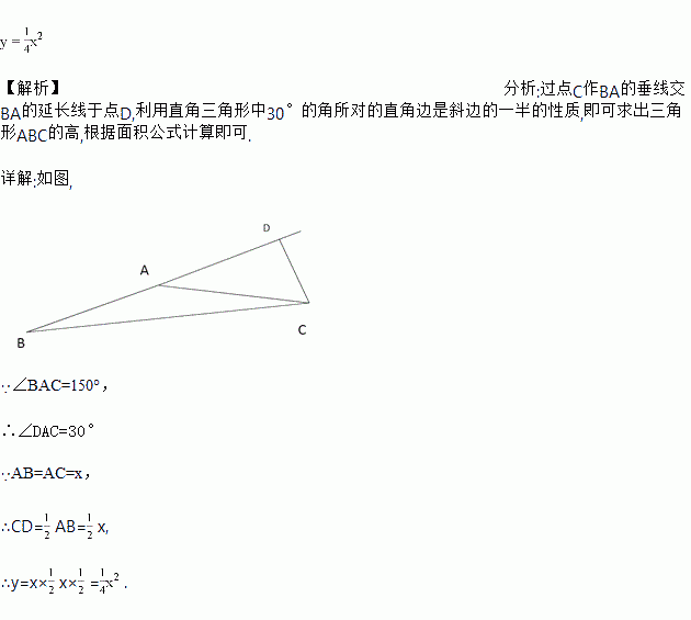 如图,在等腰△ABC中,∠BAC=150°,若设AB=AC=x,△ABC的面积是y,则y与x的函数关系式为___________________________.