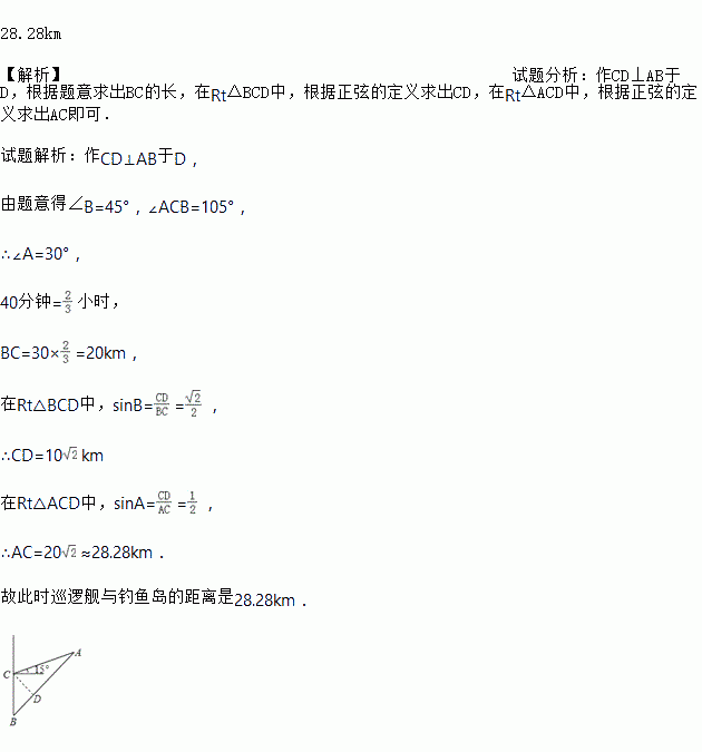 钓鱼岛自古就是中国的!2017年5月18日,中国海警2305,2308,2166,33115舰船队在中国的钓鱼岛领海内巡航,如图,我军以30km/h的速度在钓鱼岛A附近进行合法巡逻,当巡逻舰行驶到B处时,战士发现A在他的东北方向,巡逻舰继续向北航行40分钟后到达点C,发现A在他的东偏北15°方向,求此时巡逻舰与钓鱼岛的距离(