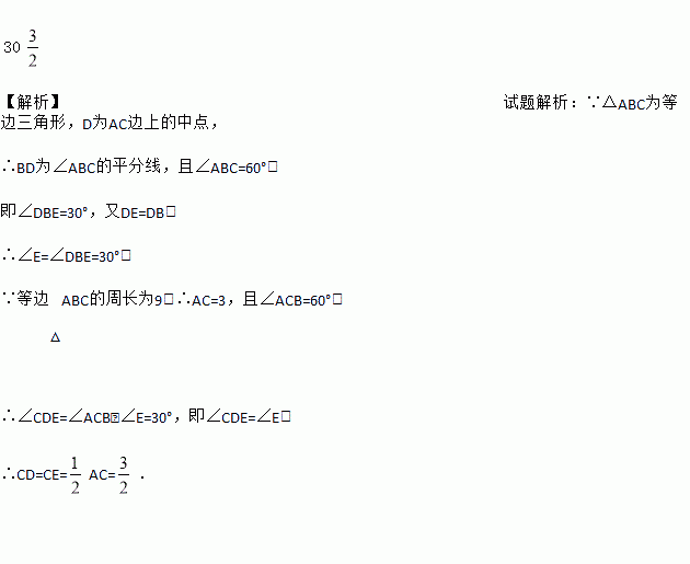 如图,D是等边△ABC的AC边上的中点,点E在BC的延长线上,DE=DB,△ABC的周长是9,则∠E=_____°,CE=_____.