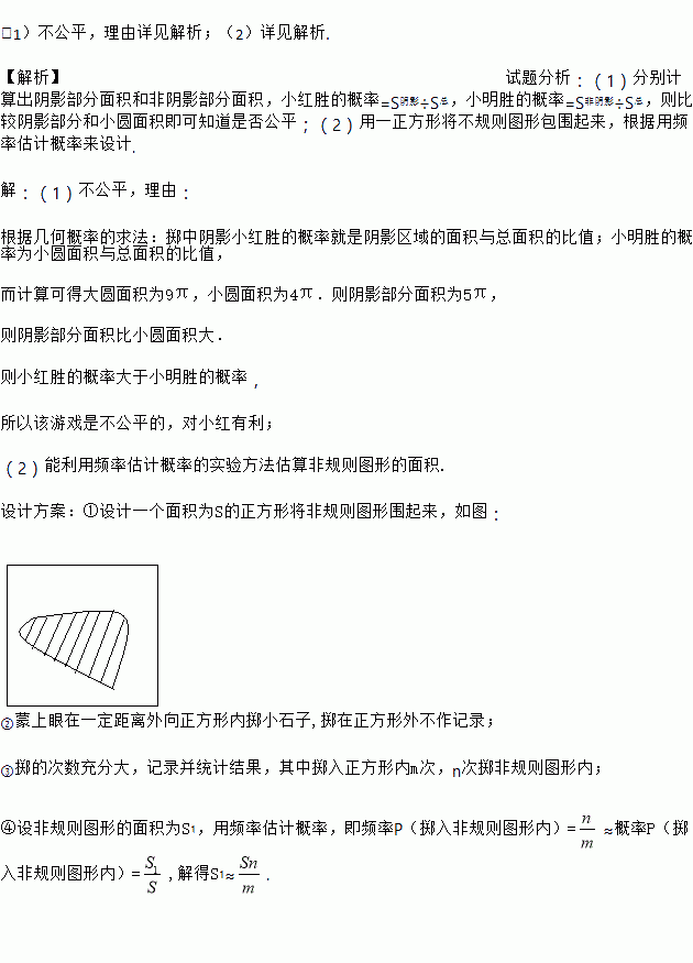 СºìºÍСÃ÷ÔÚ²Ù³¡×öÓÎÏ·£¬ËûÃÇÏÈÔÚµØÉÏ»Á˰뾶·Ö±ð2mºÍ3mµÄͬÐÄÔ²£¨Èçͼ£©£¬ÃÉÉÏÑÛÔÚÒ»¶¨¾àÀëÍâÏòȦÄÚÖÀСʯ×Ó£¬ÖÀÖÐÒõӰСºìʤ£¬·ñÔòСÃ÷ʤ£¬Î´ÖÀÈëȦÄÚ²»Ë㣬ÄãÀ´µ±²ÃÅУ®
