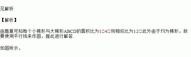如图,梯形ABCD中,∠A=∠B=90°,且AD=AB,∠C=45°,将它分割成4个大小一样,都与原梯形相似的梯形(在图形中直接画分割线,不需要说明)