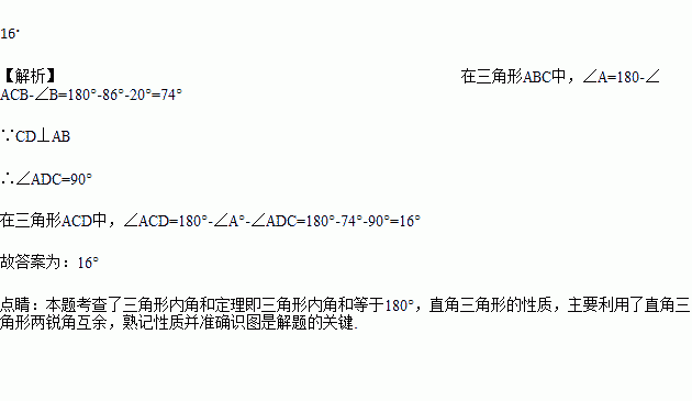 如图所示,在△ABC中,CD⊥AB,∠ACB=86°,∠B=20°,则∠ACD=________.