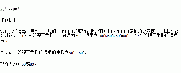 等腰三角形中,一个角为50°,则这个等腰三角形的顶角的度数为________