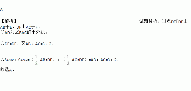 A 【解析】试题解析:过点D作DE⊥AB于E,DF⊥AC于F. ∵AD为∠BAC的平分线, ∴DE=DF,又AB:AC=3:2, ∴S△ABD:S△ACD=(AB•DE):(AC•DF)=AB:AC=3:2. 故选A.