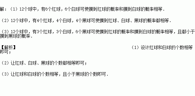 (3)使摸到红球的概率和摸到白球的概率相等,且都小于摸到黑球的概率.