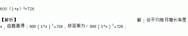 某工程一月份的产值为600万元,三月份的产值达到了726万元,设每月产值的增长率x相同,则可列出方程为_____.