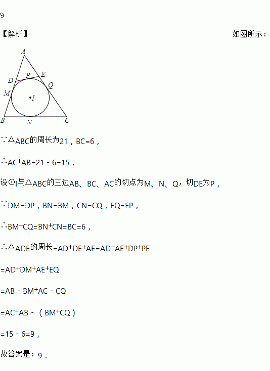 如图,⊙I为△ABC的内切圆,点D,E分别为边AB,AC上的点,且DE为⊙I的切线,若△ABC的周长为21,BC边的长为6,△ADE的周长为_____.