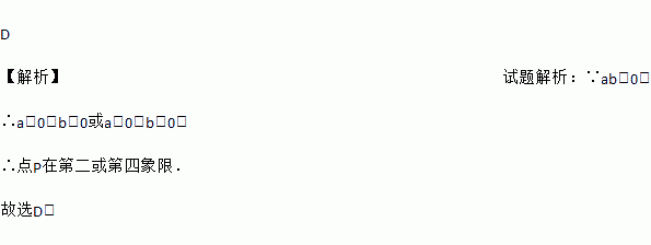 D 【解析】试题解析:∵ab<0, ∴a<0、b>0或a>0、b<0, ∴点P在第二或第四象限. 故选D.