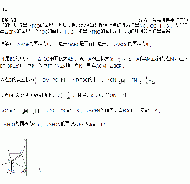 (k<0)的图象经过点A与BC的中点F,连接AF、OF,若△AOF的面积为9,则k的值为________.
