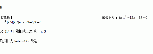 已知三角形两边的长是3和4,第三边的长是方程x2-12x+35=0的根,则该三角形的周长是( )