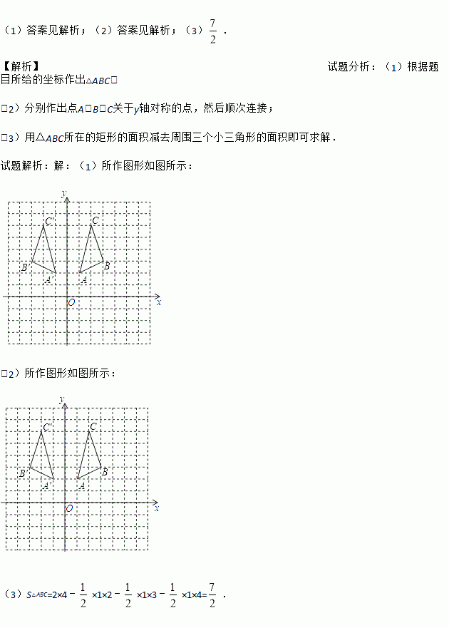(1)答案见解析;(2)答案见解析;(3). 【解析】试题分析:(1)根据题目所给的坐标作出△ABC; (2)分别作出点A、B、C关于y轴对称的点,然后顺次连接; (3)用△ABC所在的矩形的面积减去周围三个小三角形的面积即可求解. 试题解析:【解析】 (1)所作图形如图所示: (2)所作图形如图所示: (3)S△ABC=2×4﹣×1×2﹣×1×3﹣×1×4...