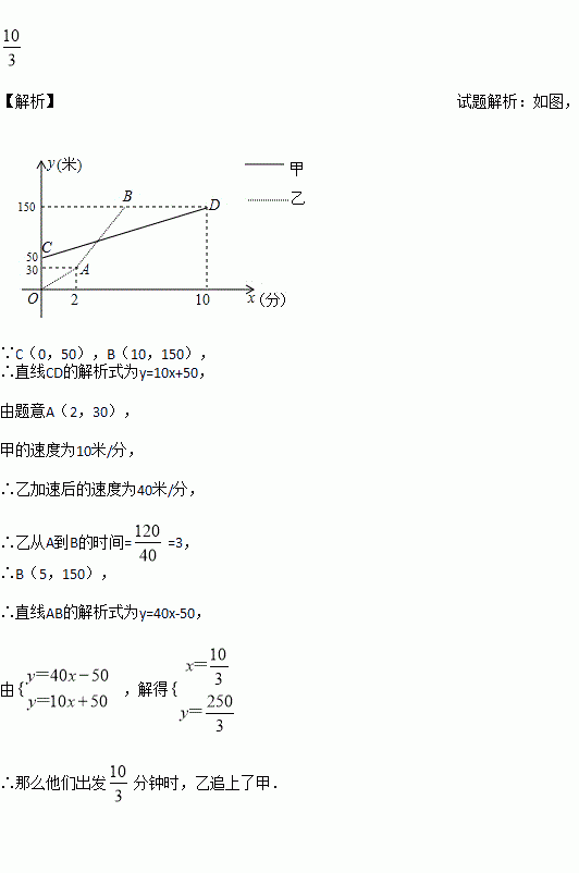 甲、乙两人分别从两地同时出发登山,甲、乙两人距山脚的竖直高度y(米)与登山时间x(分)之间的图象如图所示,若甲的速度一直保持不变,乙出发2分钟后加速登山,且速度是甲速度的4倍,那么他们出发_____分钟时,乙追上了甲.