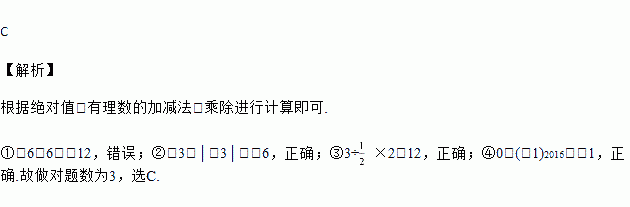 ①-6-6=0;②-3-|-3|=-6;③3÷×2=12;④0-(-1)2 016=-1.