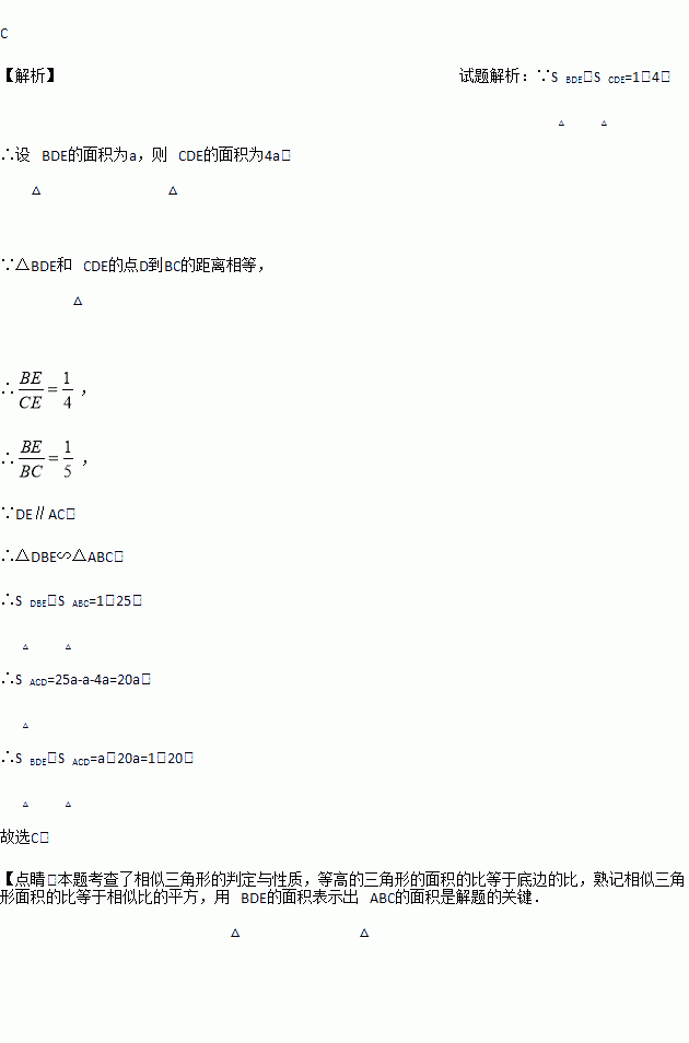 如图,在△ABC中,D、E分别是AB、BC上的点,且DE∥AC,若S△BDE:S△CDE=1:4,则S△BDE:S△ACD=( )