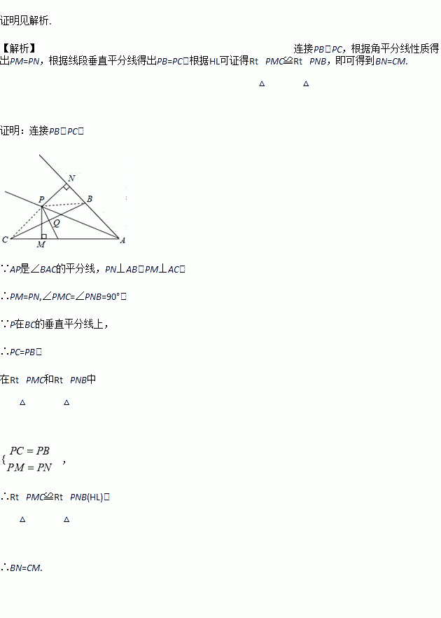 如图,在△ABC中,∠BAC的平分线与BC的垂直平分线PQ相交于点P,过点P分别作PN⊥AB,PM⊥AC,垂足分别为点N,M.求证:BN=CM