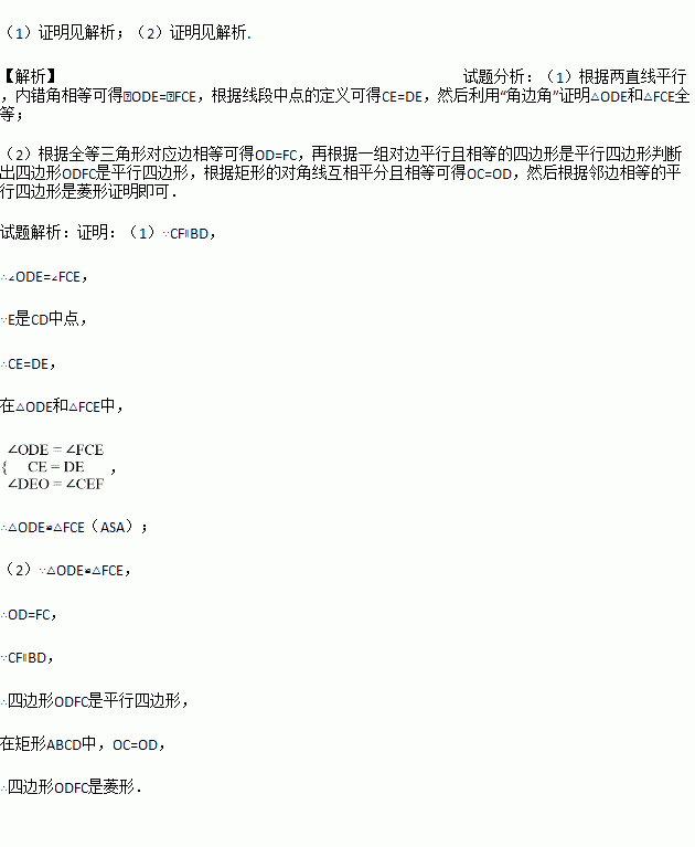 已知:如图,在矩形ABCD中,对角线AC、BD相交于点O,E是CD中点,连结OE.过点C作CF∥BD交线段OE的延长线于点F,连结DF.求证: