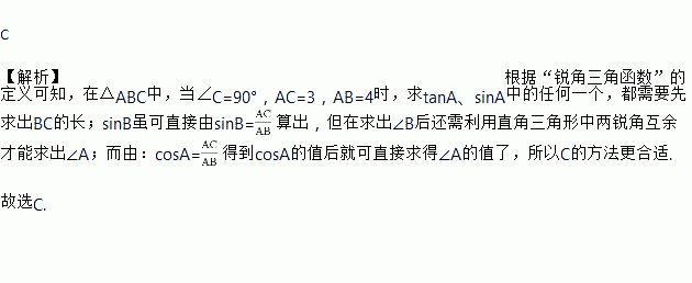 在△ABC中,∠C=90°,AC=3,AB=4,欲求∠A的值,最适宜的做法是( )
