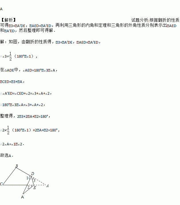 A 【解析】试题分析:根据翻折的性质可得∠3=∠A′DE,∠AED=∠A′ED,再利用三角形的内角和定理和三角形的外角性质分别表示出∠AED和∠A′ED,然后整理即可得解. 【解析】 如图,由翻折的性质得,∠3=∠A′DE,∠AED=∠A′ED, ∴∠3=(180°﹣∠1), 在△ADE中,∠AED=180°﹣∠3﹣∠A, ∠CED=∠3+∠A, ∴∠A′ED...