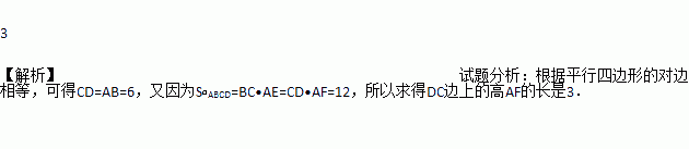 如图,已知□ABCD中,AB=4,BC=6,BC边上的高AE=2,则DC边上的高AF的长是 。