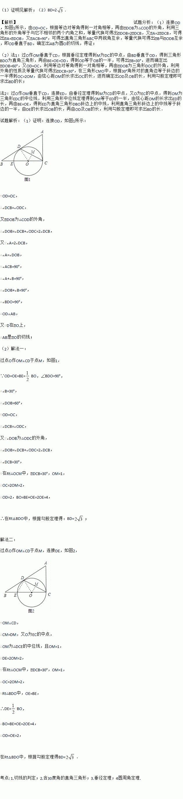 (2)若CD的弦心距为1,BE=EO,求BD的长.