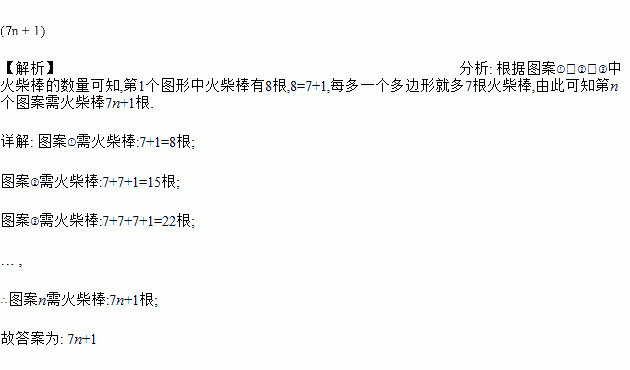 下列图案是用长度相同的火柴棒按一定规律拼搭而成,图案需8根火材棒,图案需15根火柴棒,,按此规律,图案需________________根火材棒.