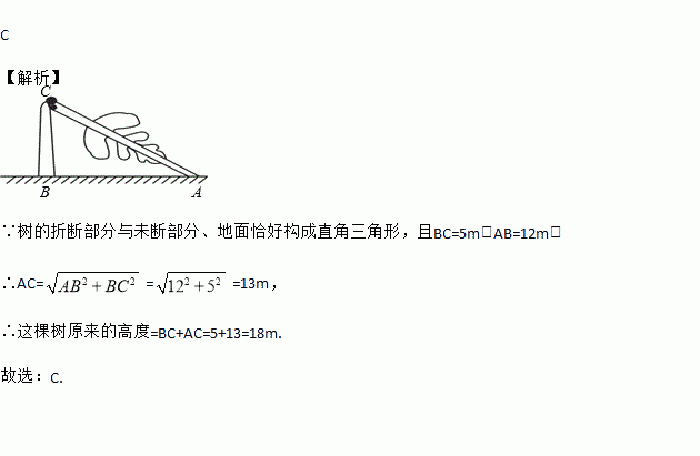 如图,一棵大树在一次强台风中距地面5m处折断,倒下后树顶端着地点A距树底端B的距离为12m,这棵大树在折断前的高度为( )