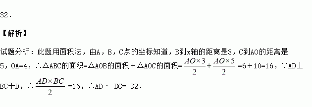 如图所示,直线BC经过原点O,点A在x轴上,AD⊥BC于D,若B(m,3),C(n,-5),A(4,0),则AD·BC= .