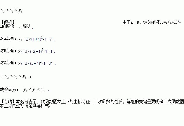 已知点A(1,y1),B(-2,y2),C(3,y3)在函数的图像上,试确定y1、y2、y3的大小关系(用“<”表示):__________.