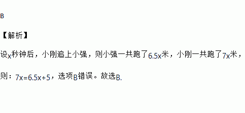 小刚、小强两人练习赛跑,小刚每秒跑7米,小强每秒跑6.5米,小刚让小强先跑5米,设x秒钟后,小刚追上小强,下列四个方程中不正确的是( )