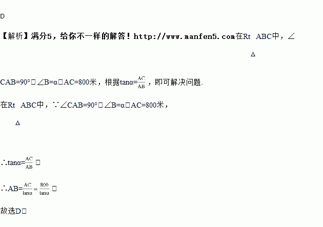 如图,某地修建高速公路,要从A地向B地修一条隧道(点A、B在同一水平面上).为了测量A、B两地之间的距离,一架直升飞机从A地出发,垂直上升800米到达C处,在C处观察B地的俯角为α,则A、B两地之间的距离为( )