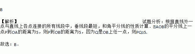 B 【解析】试题分析:根据直线外一点与直线上各点连接的所有线段中,垂线段最短,和角平分线的性质计算.∠AOB的平分线上一点P到OA的距离为5,则P到OB的距离为5,因为Q是OB上任一点,则PQ≥5. 故选:B.