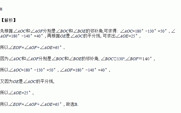 如图,直线AB,CD相交于点O,OE是∠AOC的平分线,∠BOC=130°,∠BOF=140°,则∠EOF的度数为( )