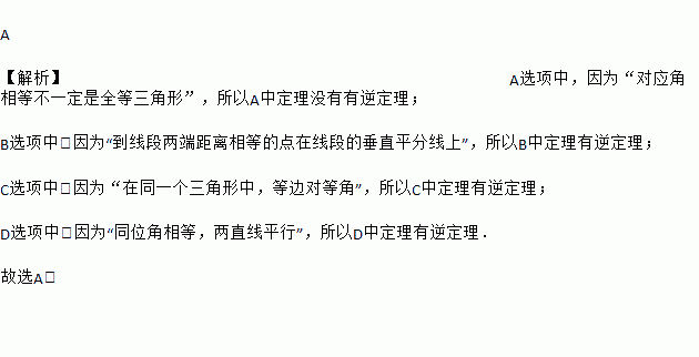 A 【解析】A选项中,因为“对应角相等不一定是全等三角形”,所以A中定理没有有逆定理; B选项中,因为“到线段两端距离相等的点在线段的垂直平分线上”,所以B中定理有逆定理; C选项中,因为“在同一个三角形中,等边对等角”,所以C中定理有逆定理; D选项中,因为“同位角相等,两直线平行”,所以D中定理有逆定理. 故选A.
