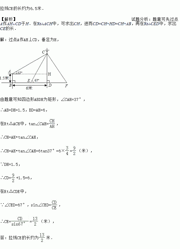 如图,在电线杆CD处引拉线CE,CF固定电线杆,拉线CE和地面所成的角∠CED=67°,在离电线杆6米的B处安置高为1.5米的测角仪AB,在A处测得电线杆上C处的仰角为37°,求拉线CE的长(参考数据:sin67°≈