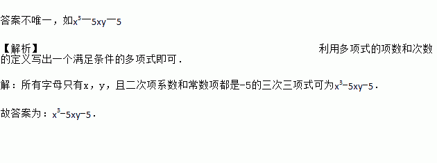 答案不唯一,如x3―5xy―5 【解析】利用多项式的项数和次数的定义写出一个满足条件的多项式即可. 【解析】 所有字母只有x,y,且二次项系数和常数项都是-5的三次三项式可为x3-5xy-5. 故答案为:x3-5xy-5.