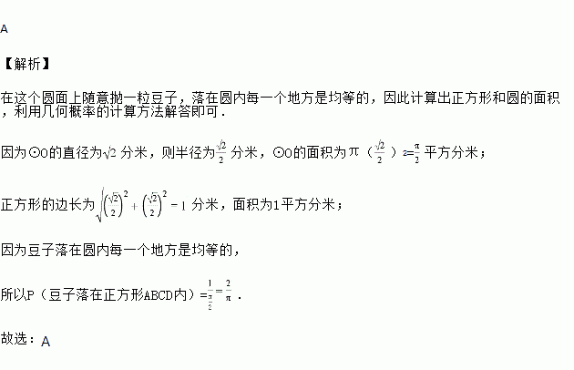 如图,正方形ABCD内接于☉O,☉O的直径为 cm,若在这个圆面上随意抛一粒豆子,则豆子落在正方形ABCD内的概率是( )