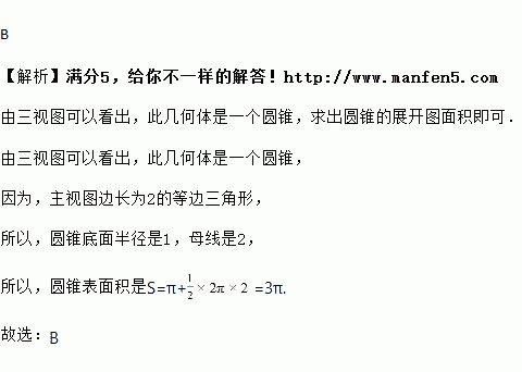 是一个几何体的三视图,已知主视图和左视图都是边长为2的等边三角形,则这个几何体的表面积为( )