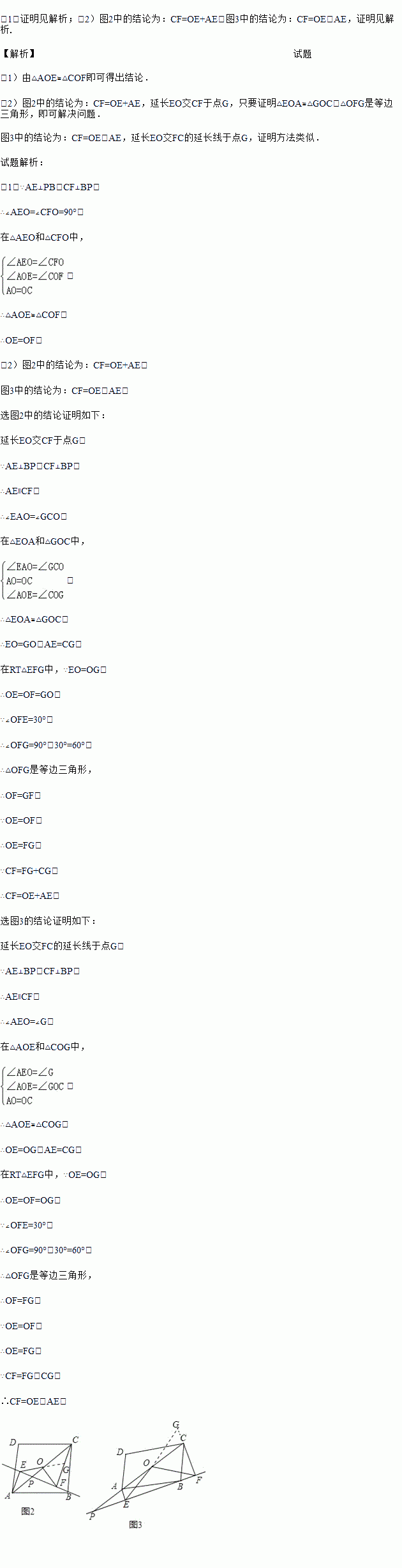 (2)直线BP绕点B逆时针方向旋转,当∠OFE=30°时,如图2、图3的位置,猜想线段CF、AE、OE之间有怎样的数量关系?请写出你对图2、图3的猜想,并选择一种情况给予证明.