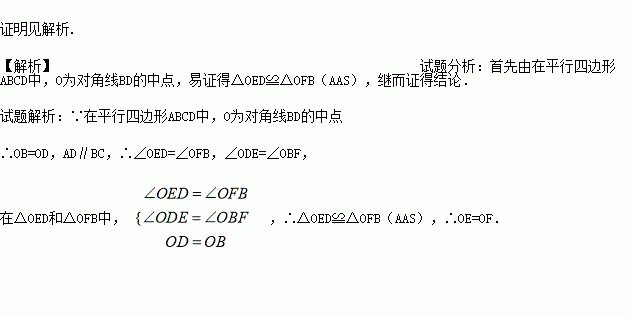 已知:如图,在平行四边形ABCD中,O为对角线BD的中点,过点O的直线EF分别交AD,BC于E,F两点,求证:OE=OF.